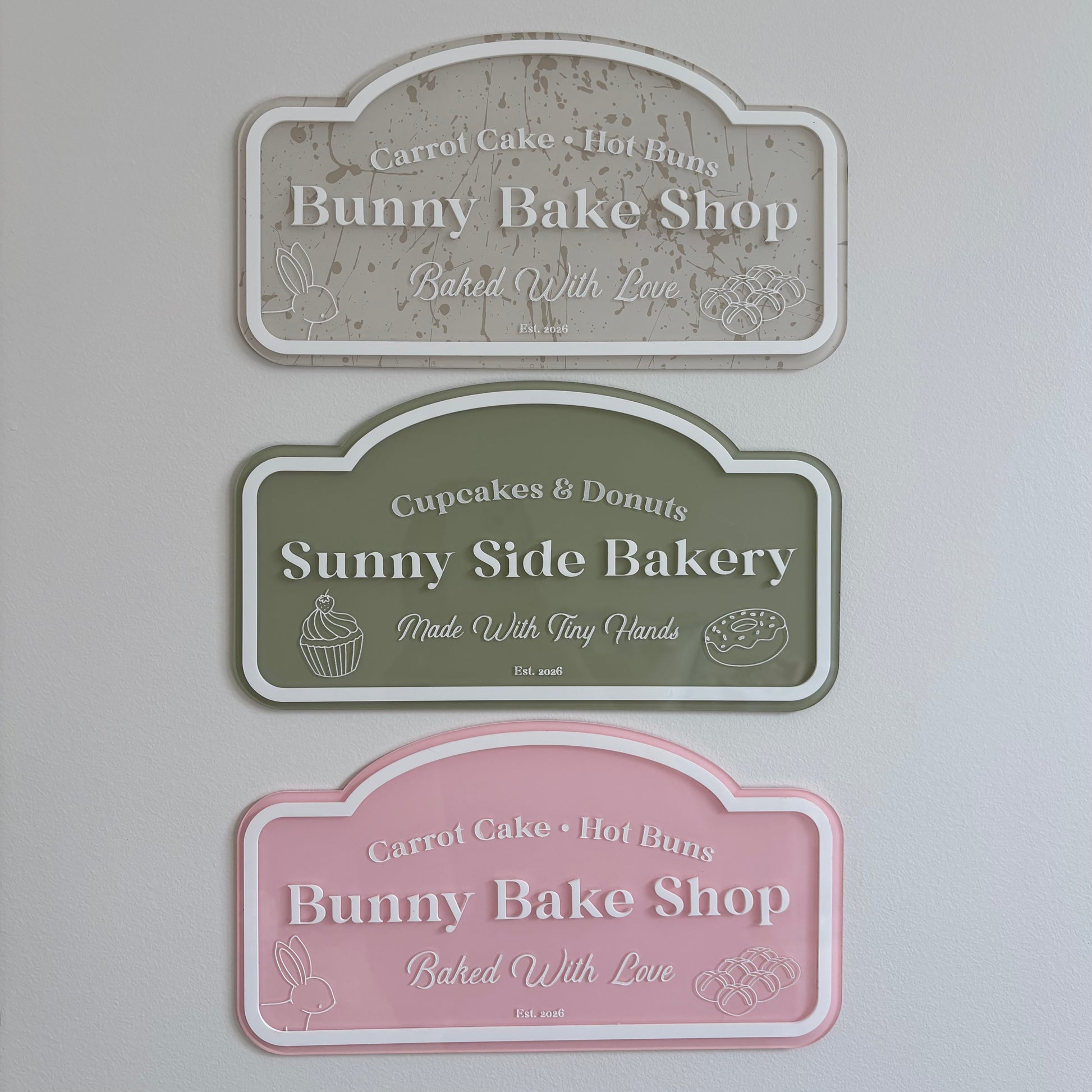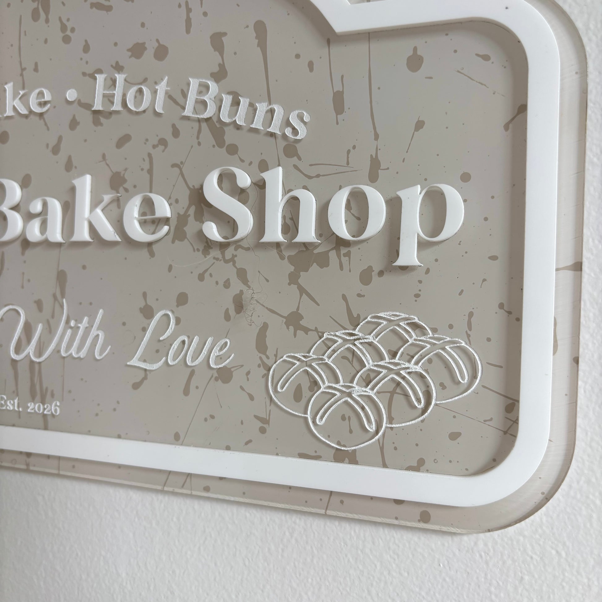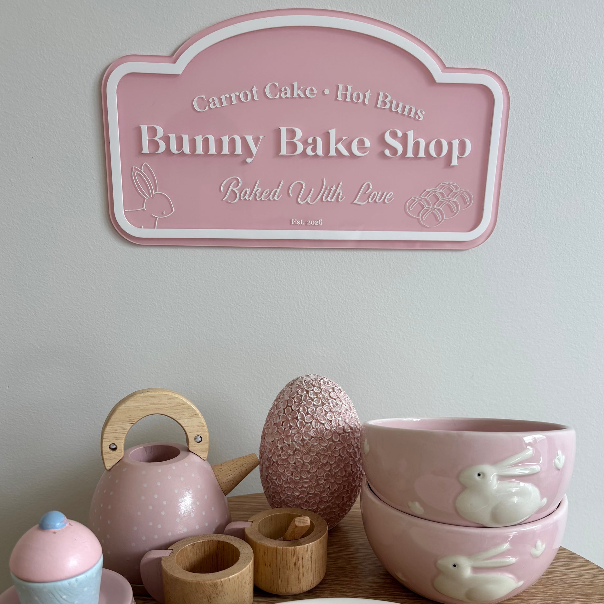 Featuring “Bunny Bake Shop” in raised white acrylic, the design includes playful café wording with carrot cake and hot buns, finished with “baked with love” underneath. Engraved white bunny and hot cross bun illustrations add a gentle hand-drawn feel, while a raised white acrylic border frames the piece.