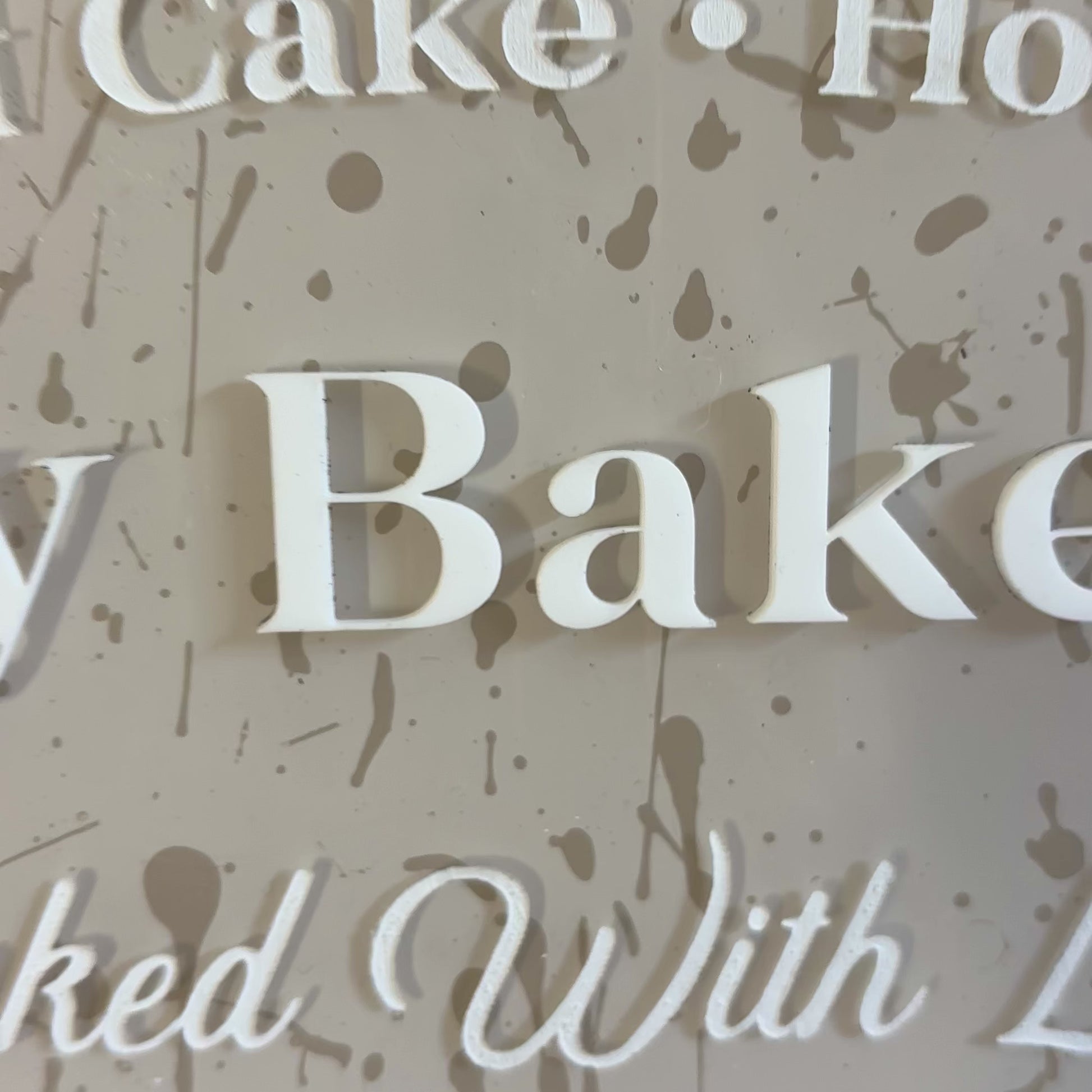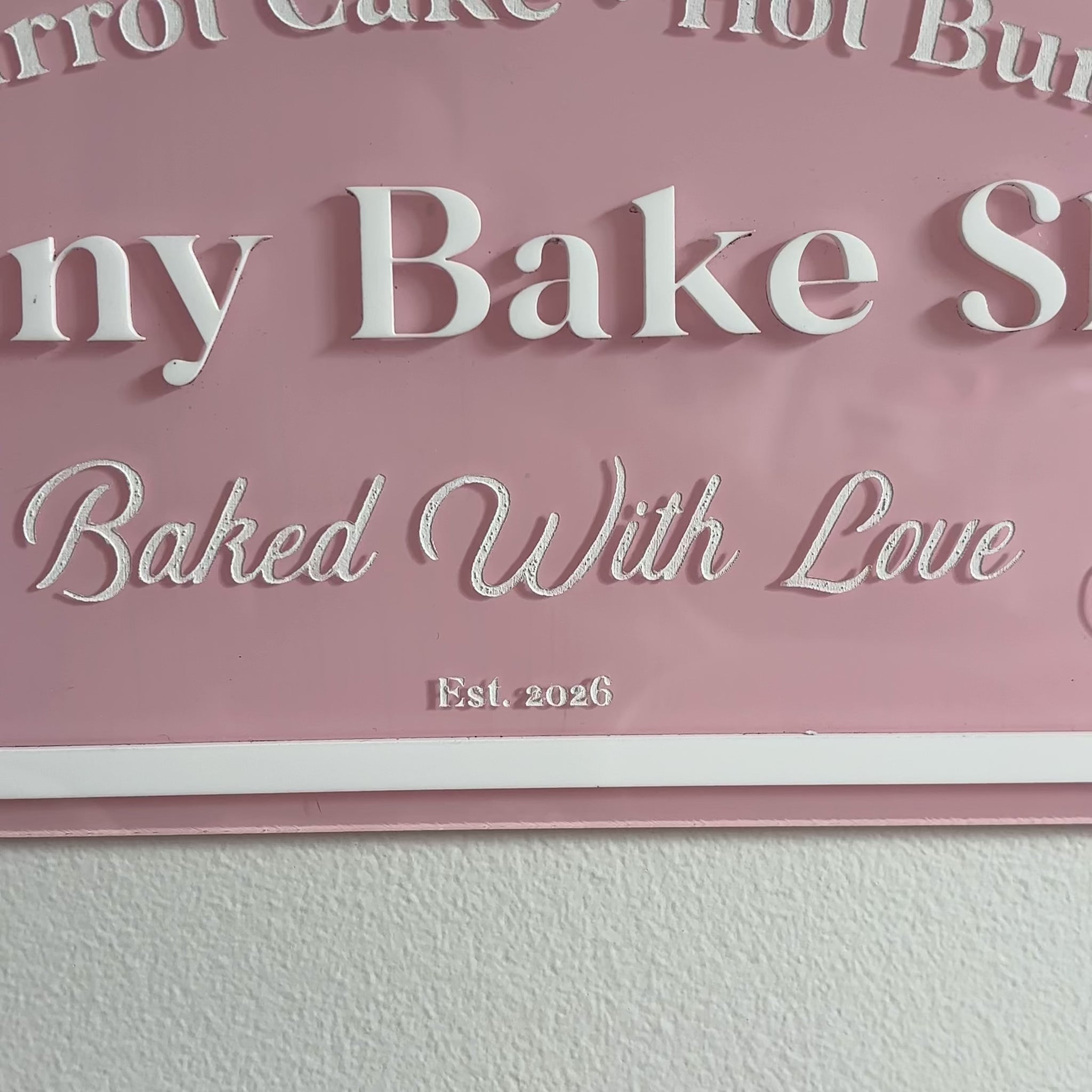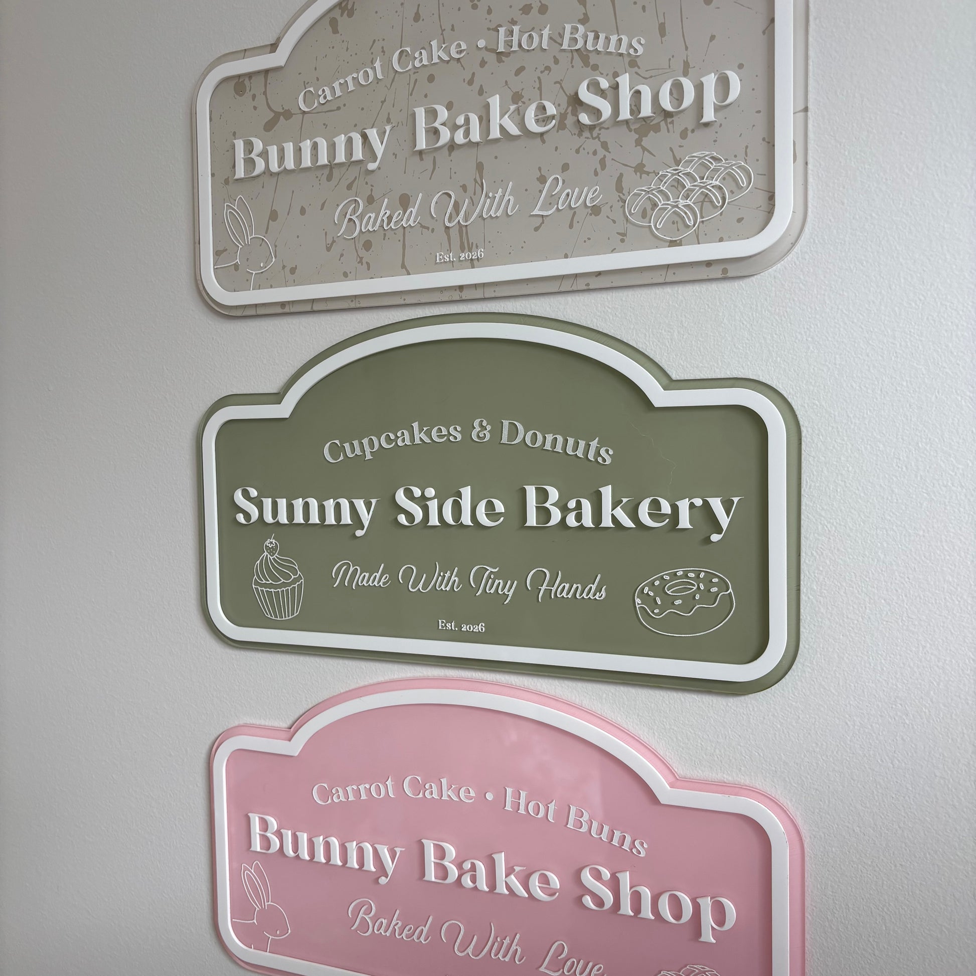 Featuring “Bunny Bake Shop” in raised white acrylic, the design includes playful café wording with carrot cake and hot buns, finished with “baked with love” underneath. Engraved white bunny and hot cross bun illustrations add a gentle hand-drawn feel, while a raised white acrylic border frames the piece.