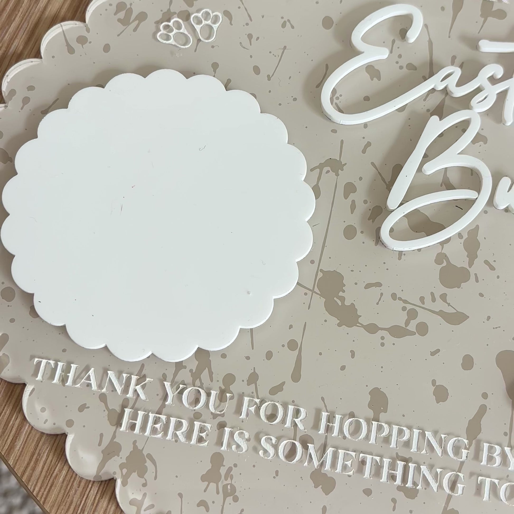 This tray features an Easter Bunny in raised white acrylic, with all remaining details engraved and paint-filled in white. Designed with designated space for a drink and a treat, plus a message area to complete the tradition.