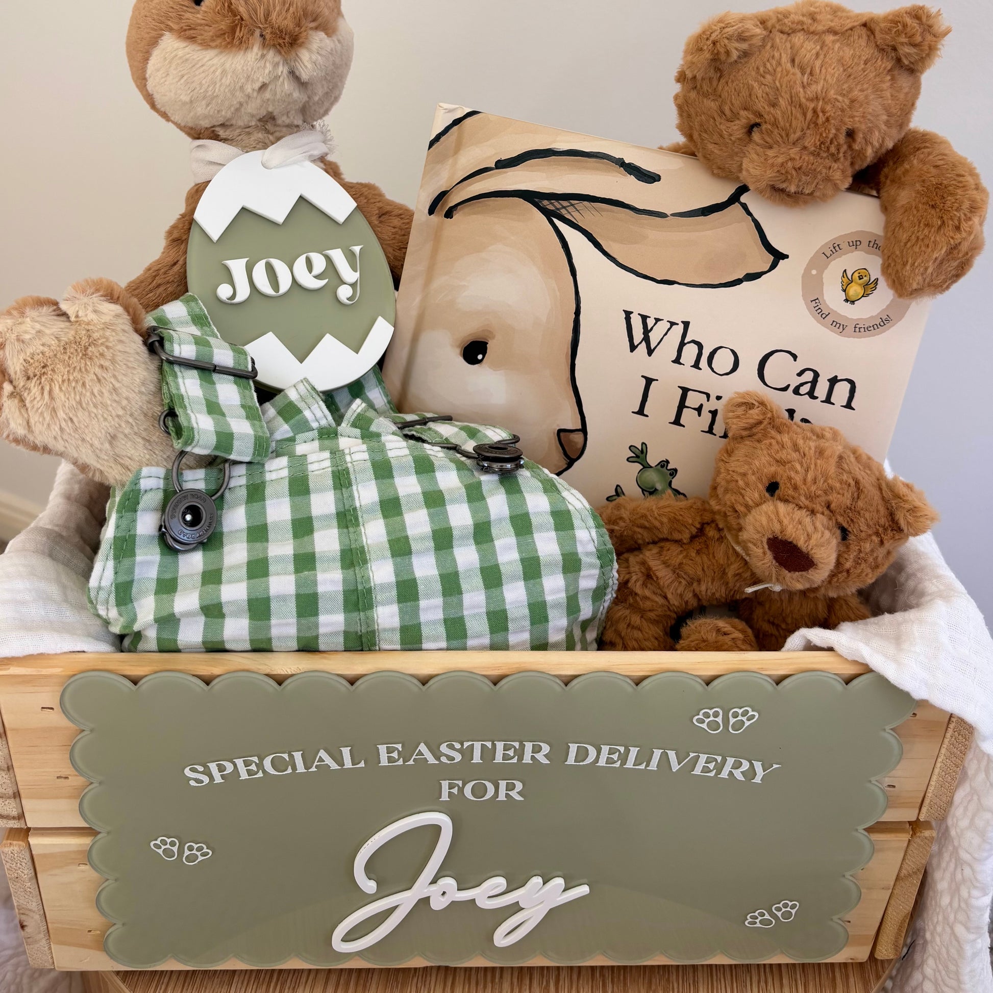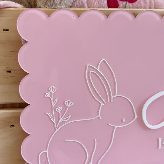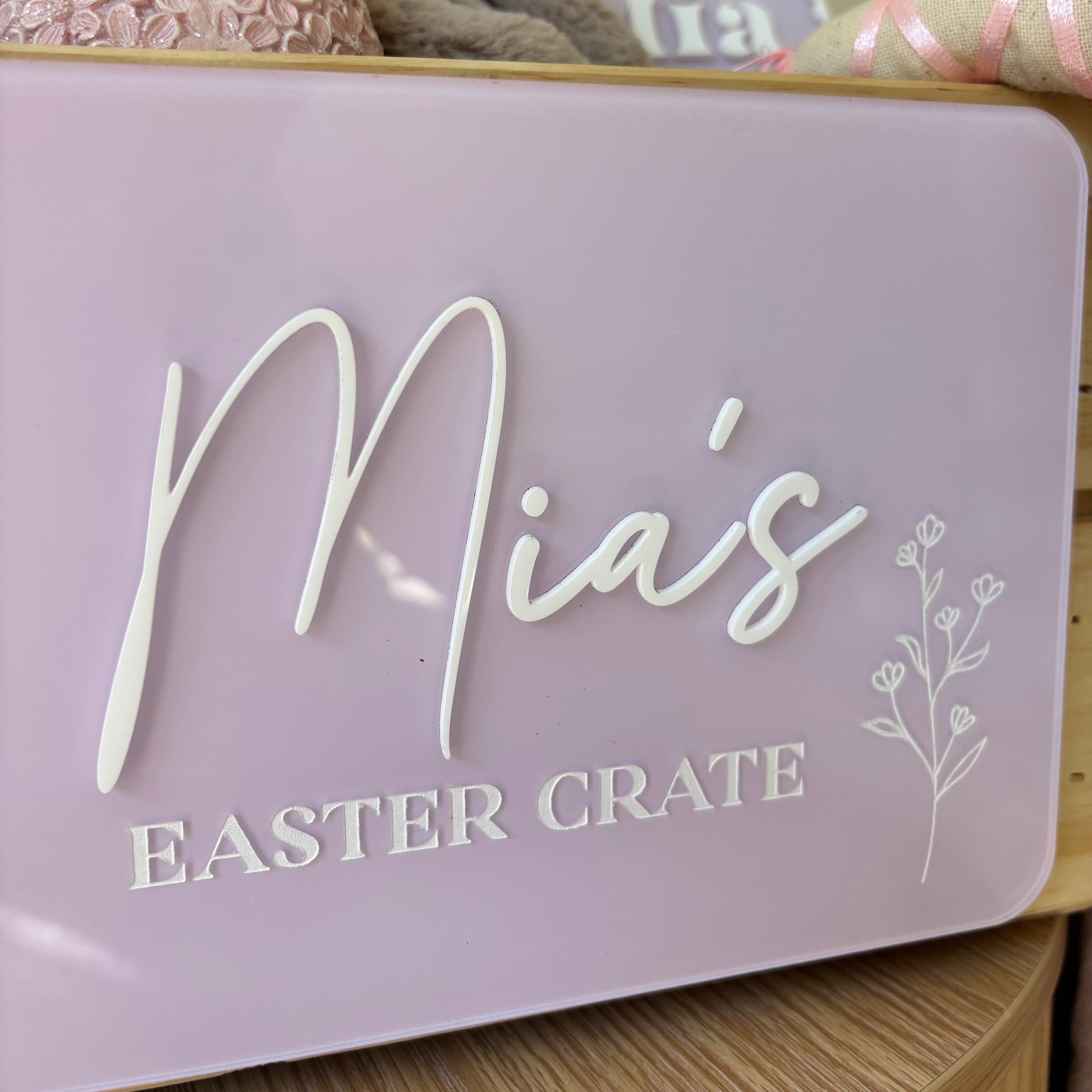 - Design One: Raised acrylic name with Easter Crate underneath, finished with engraved white bunny and wildflower details
