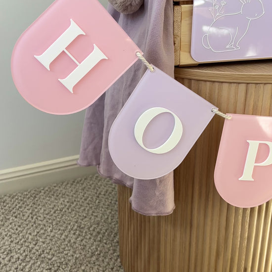 Each pennant is finished in our signature Easter colour palette and strung together with natural twine for easy hanging and styling. The raised white acrylic lettering adds dimension while keeping the overall look simple and timeless.