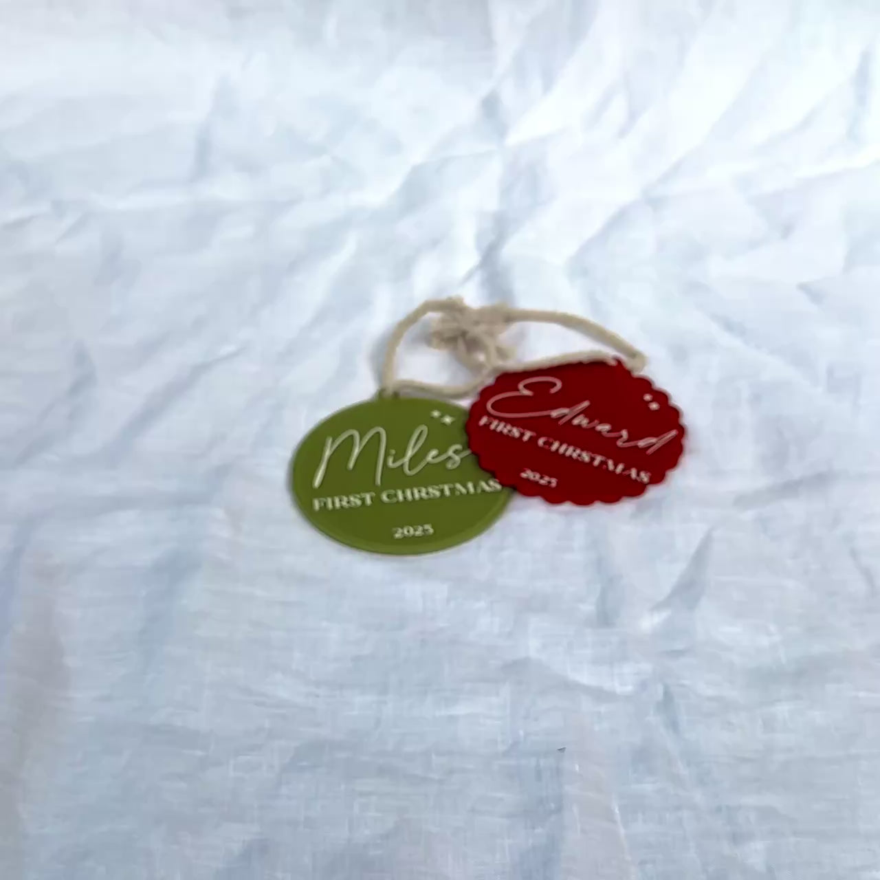 Each ornament is made from premium acrylic, featuring hand-painted features, made to order, and vinyl lettering on the front for a timeless, elegant finish. Choose between a classic round design for a clean, simple look, or a scalloped edge for a soft, decorative touch.