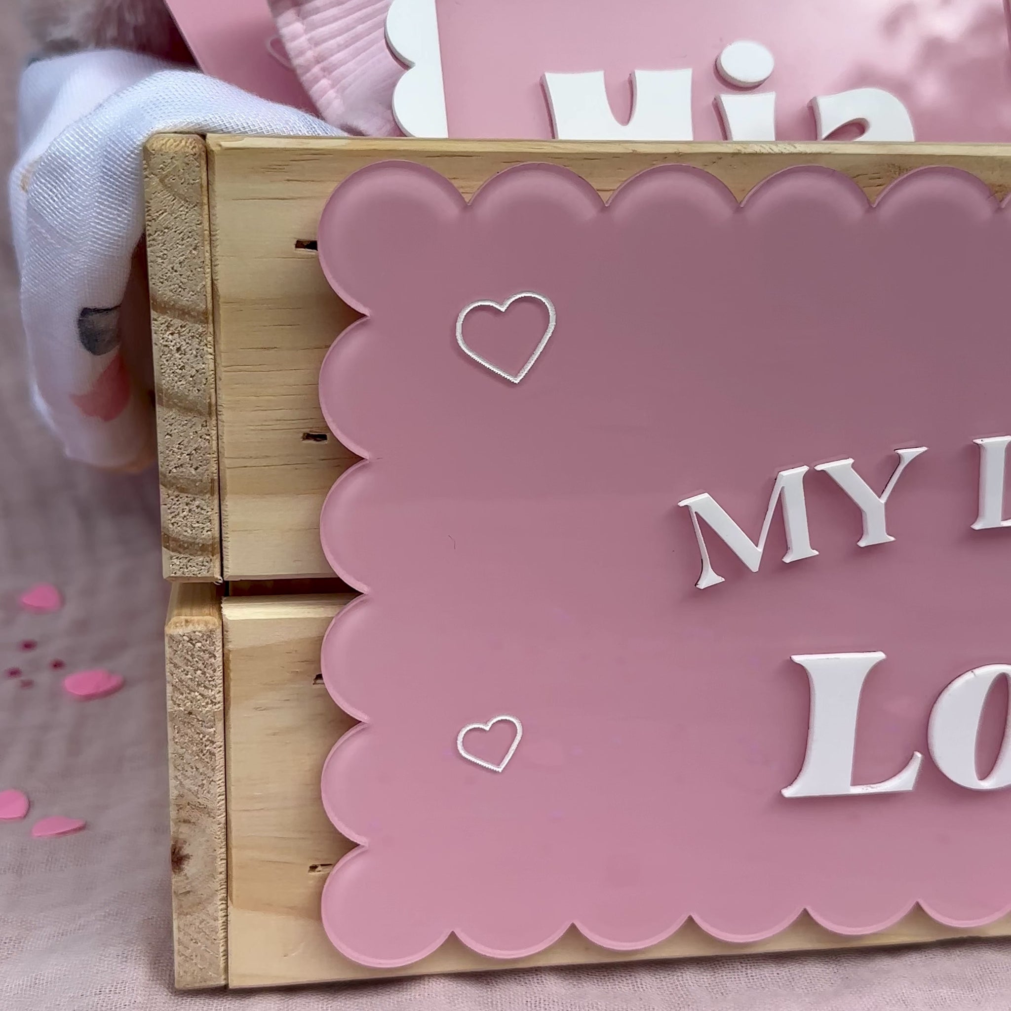 Features My Little Love in raised white acrylic lettering for a simple, heartfelt finish.
