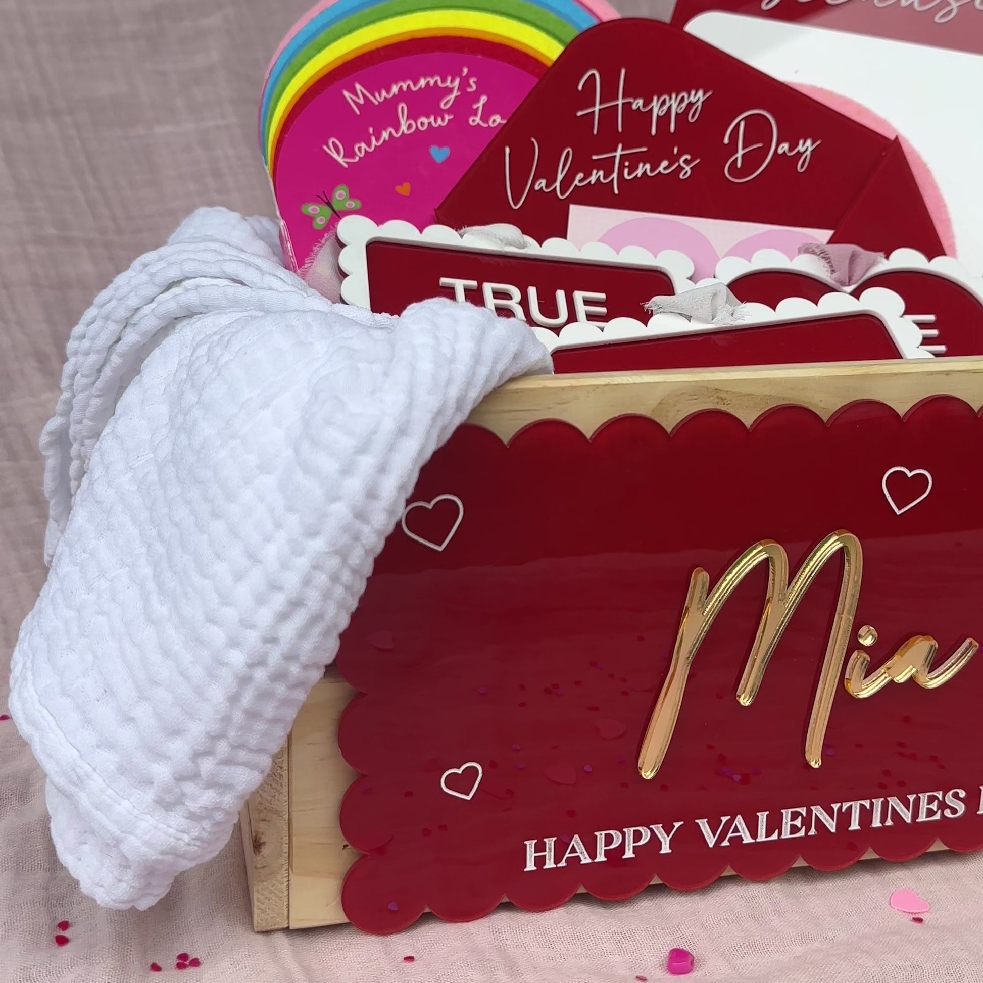 Features your chosen name in raised gold acrylic, paired with Happy Valentine’s Day in white lettering.